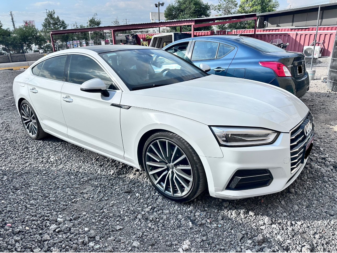 A vintage car with the license plate number 898 CVN is elevated on blue jack stands under a tent. The car appears to be in a service area, possibly during a motor event or race. Its sleek, shiny body and classic design are prominent.